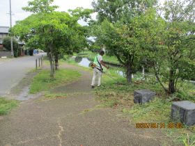 8月の活動は猛暑のなか、フレンド公園の芝刈後の残材処理及びポット土入れと吉野橋〜中学橋の稗田川右岸草刈りおよび稗田橋〜中学橋左岸、歩道草刈りと八反田公園の草刈りなどを実施しました。暑さ厳しい中熱中症の気を付けながら作業を完了しました。