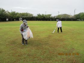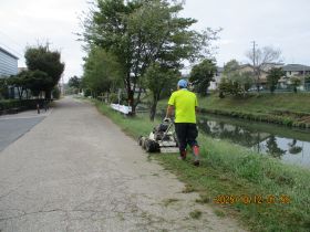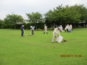 内容はフレンド公園の芝生残材処理、目土砂入れ、貝塚伊吹下草刈りと、稗田川左岸の中学橋から稗田橋間の草刈りとゴミ拾いなどです。
