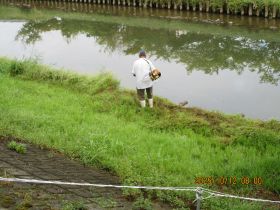 昨夜の雨はあがりましたが、非常に蒸し暑い中での作業となりました。法響橋から中学橋の稗田川右岸 高校グラウンドの前の土手の草刈りを実施しました。昨夜の雨で適度に草が湿っており、ほこりを余り立てることなく草刈り実施出来ました。