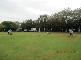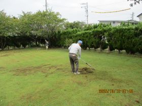 フレンド公園の芝生残材処理、目土砂入れ、肥料撒きを実施しました。